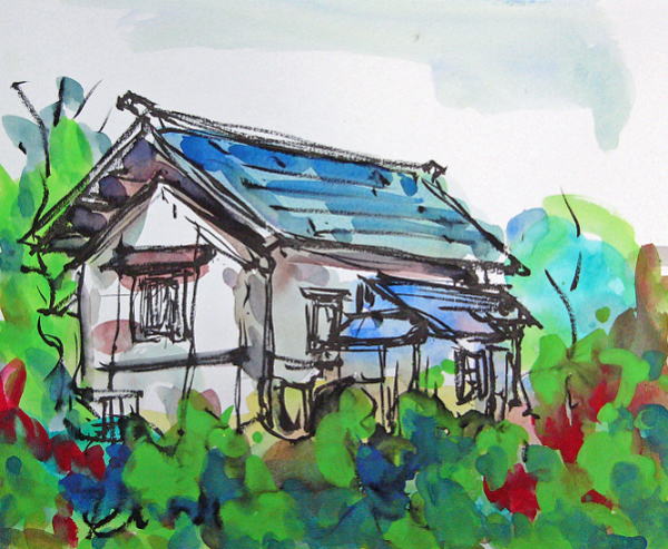 hs-031 白壁土蔵の見える風景 A4大 2008.08.17 (筆ペン、水彩)