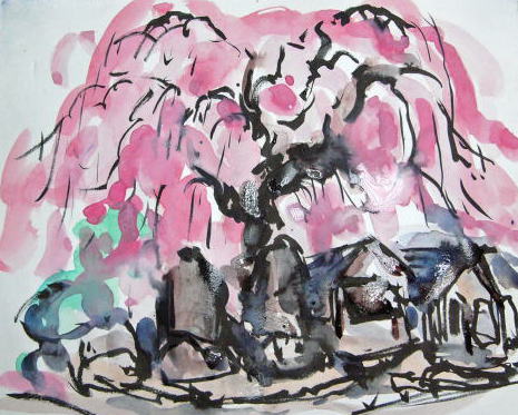 hs-042 古木しだれ桜の見える風景 A4大 2009.04.14 (筆ペン、水彩)