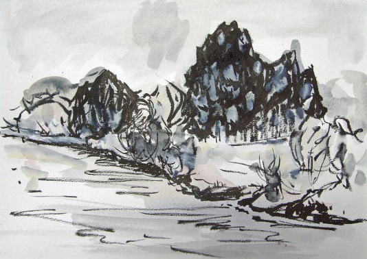 hs-047 最上川冬景(三ケの瀬) A4大 2010.01.19 (筆ペン、鉛筆、水彩)