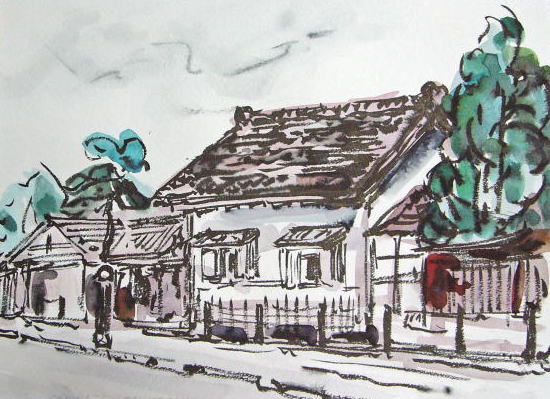hs-055 蔵の見える風景(谷地) A4大 2010.04.05 (筆ペン、水彩)
