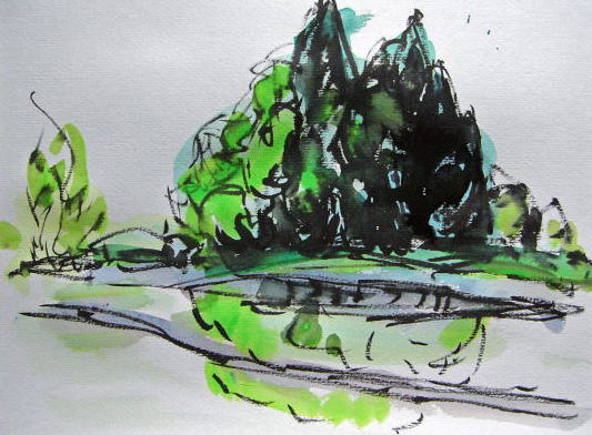 同スケッチはお月山(おつきやま)神社が水の張った田圃に映える風景を描いたもので、ここ10数年描き続けてきた