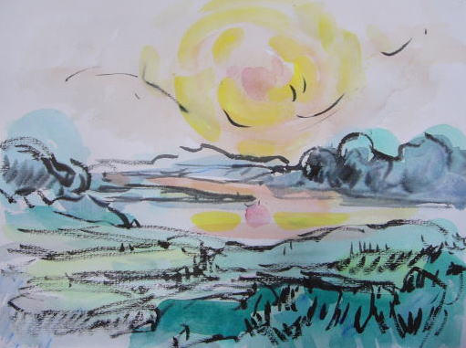 hs-065 黎明最上川風景 A4大 2010.06.10 (筆ペン、水彩)