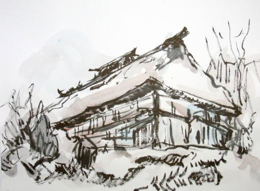 hs-072 雪中の民家 A4大 2011.01.02 (筆ペン、水彩)