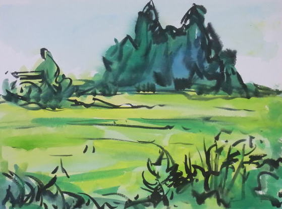 hs-159 初秋の頃(河北町沢畑地区) A4大 2012.08.26 (筆ペン、水彩)