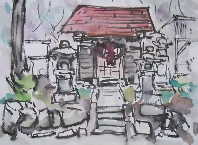 hs-174 荷渡し地蔵本堂風景 (村山市(東根市と村山市の境界付近)) A4大 2012.10.16 (筆ペン、水彩)