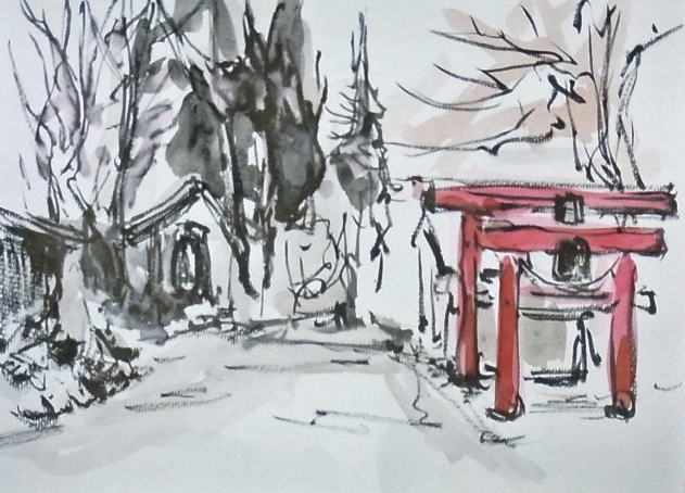 紅い鳥居と墨絵のような杉木立に絵心をくすぐられた。