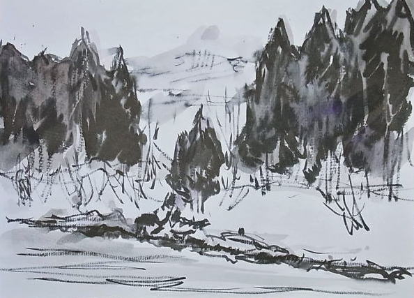 、思わぬ雪景色を今シーズンの見納めと思い墨絵風にまとめてみた。