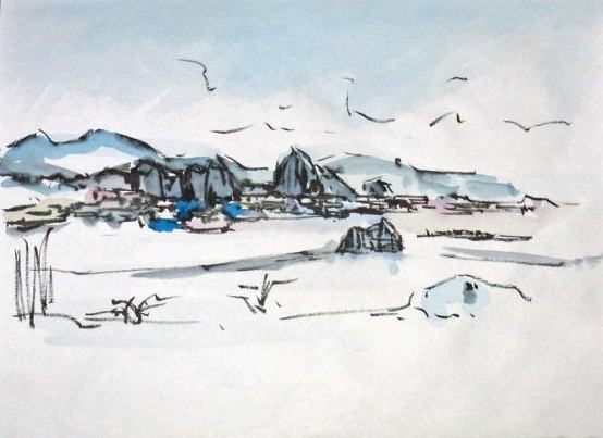 hs-205 春待つ田園風景(村山市大槙) A4大 2013.03.26 (筆ペン、水彩)