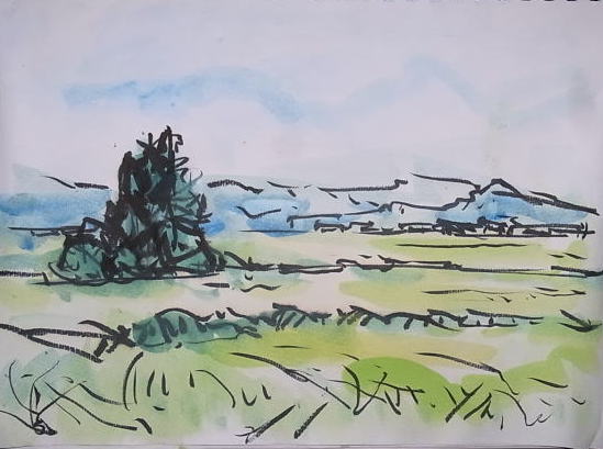 hs-231 初秋田園風景(河北町谷地) A4大 2013.09.10 (筆ペン、水彩)