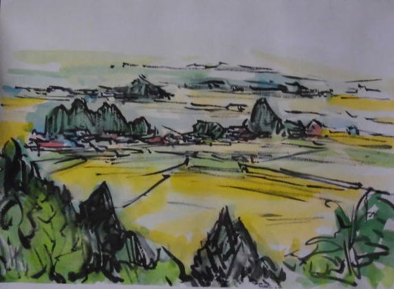 hs-233 実りの田園風景(河北町岩木地区遠望) A4大 2013.09.30 (筆ペン、水彩)