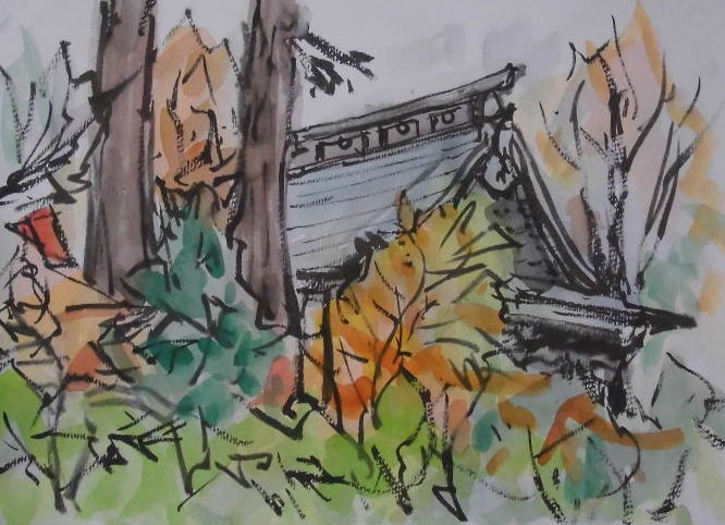 hs-242 秋の若松観音堂 A4大 2013.11.05 (筆ペン、水彩)