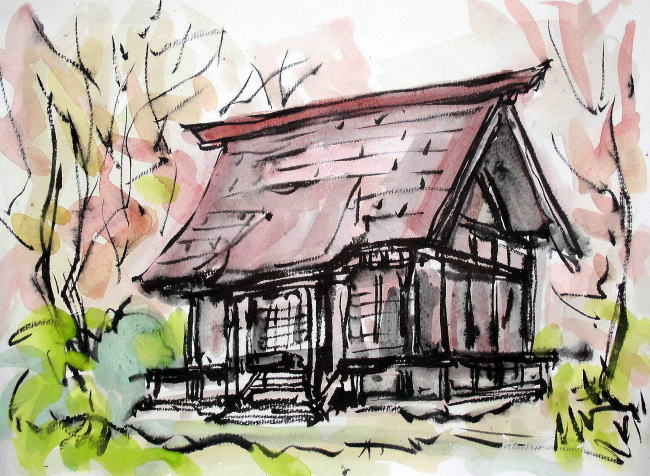 hs-257 お稲荷様のある風景 A4大 2014.11.04 (筆ペン、水彩))