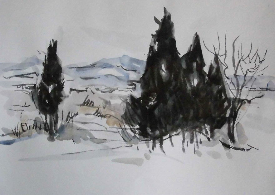 hs-278 春き最上川河畔の風景 A4大 2015.02.09 (筆ペン、水彩)