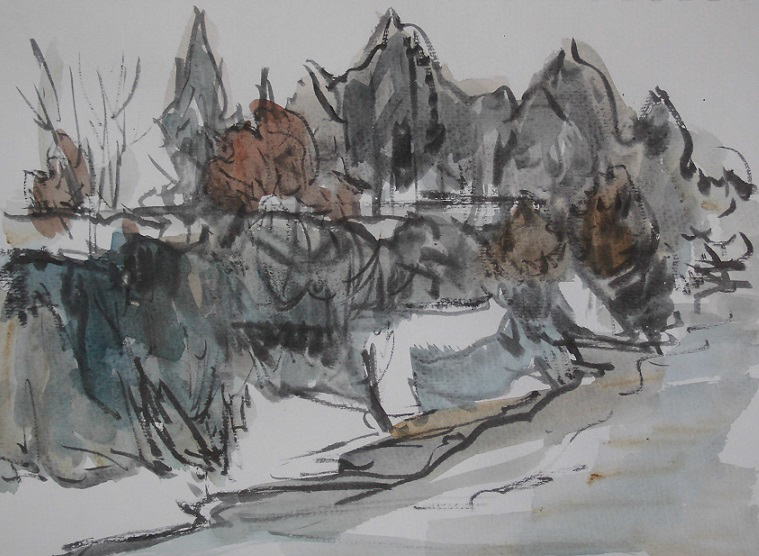 hs-282 春近き風景 A4大 2015.02.20 (筆ペン、水彩)
