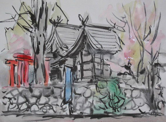 hs-292 桜咲く寒河江市八幡宮 A4大 2015.04.20 (筆ペン、水彩)