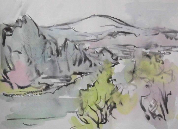 hs-293 桜咲く月山風景 A4大 2015.04.25 (筆ペン、水彩)