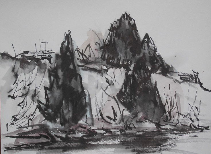 大江町を流れる最上川は河岸段丘を創り絵になりやすい風景を見せてくれる。本作品は左沢(あてらざわ)地区、その名も 最上橋右岸側上流を望んだものである。雪の中にスッと立つ杉木立が美しい。