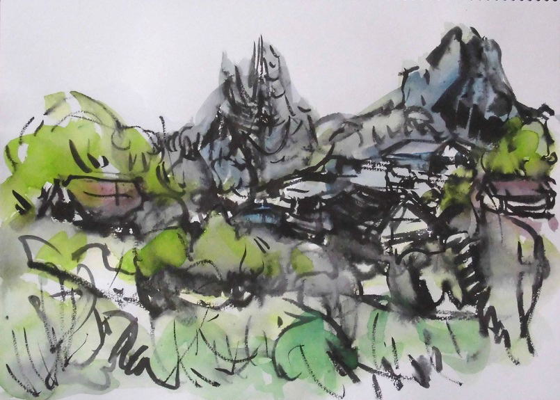 hs-336 山間の風景 A4大 2016.06.09 (筆ペン、水彩)