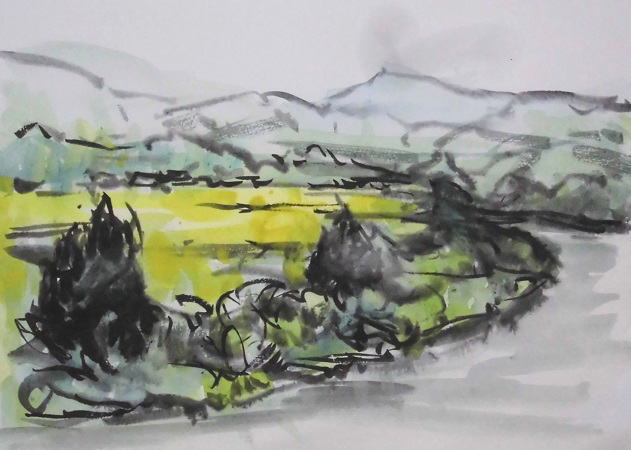 hs-343 実りの最上川風景 2016.09.27 (筆ペン、水彩)