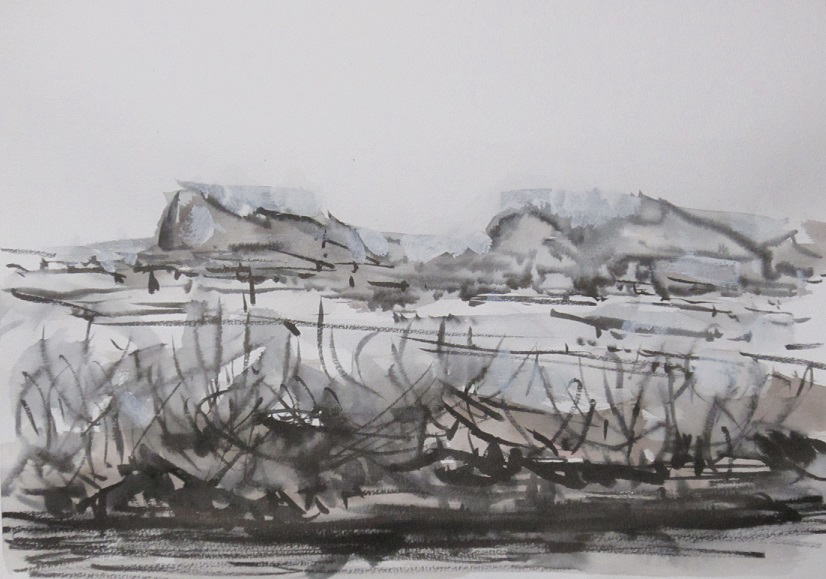 hs-365 最上川に初雪 2017.12.10 (筆ペン、水彩)
