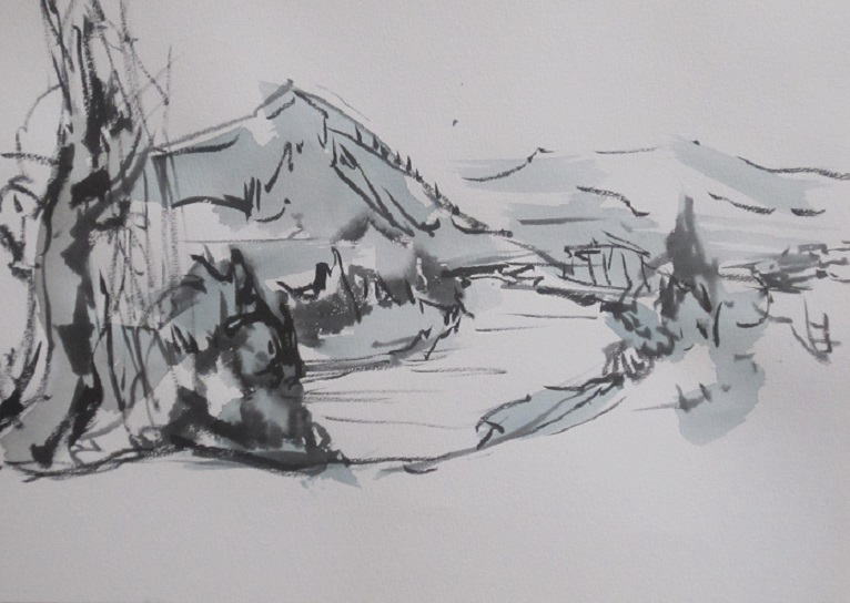 hs-373 最上川風景 2018.02.04 (筆ペン、水彩)