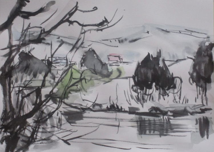 hs-377 春早・崖の上から 2018.03.04 (筆ペン、水彩)