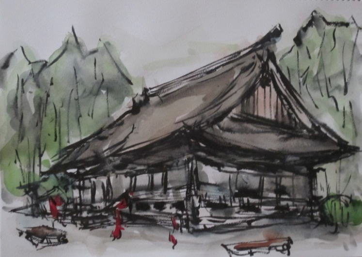hs-391 桜(はな)待つ慈恩寺本堂風景 2018.04.15 (筆ペン、水彩)