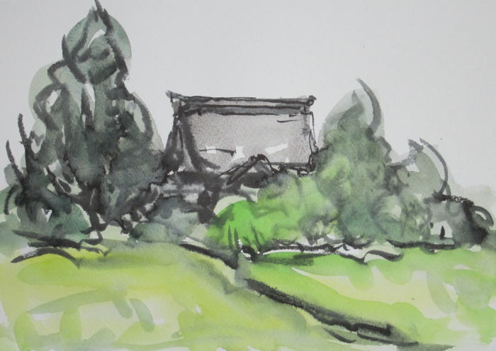 村山市大槙地区から見える大きな屋根が見える田園風景。よく見ると寺の様。