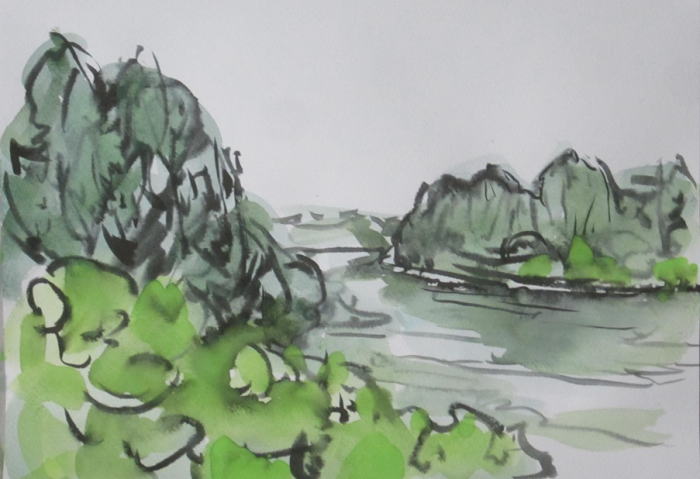 hs-663 緑の最上川風景 2022.07.14(筆ペン、水彩)