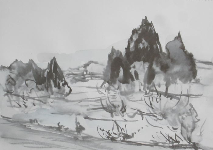 hs-707 雪止んで(三ケ瀬瀬雪景) 2023.01.11 (筆ペン、水彩)