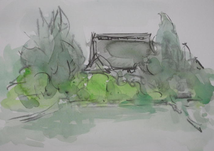 hs-837 黒屋根の見える風景 2024.05.22(筆ペン、水彩)