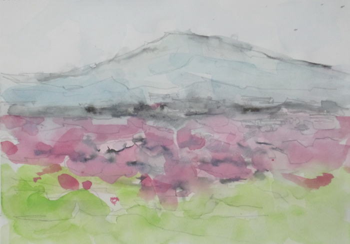 hs-902 桃花咲く風景 2025.04.30 (筆ペン、鉛筆、水彩)