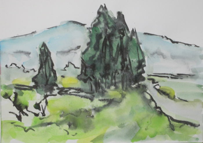 hs-904 新緑最上川河岸の風景 2025.05.10 (筆ペン、水彩)