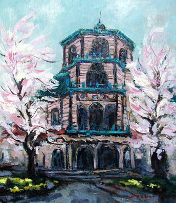 JR山形駅近く霞城公園にある旧済生館病院で、旧山形城敷地内にある。花見でにぎわう頃である。