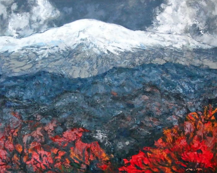 | 国道458号線、寒河江市幸中(さちゅう)と大蔵村肘折(ひじおり)間にある十部一(じゅうぶいち)峠からみた月山風景である。 峠から望む月山は手に取るように近くに見え、大迫力である。峠の深紅の紅葉に月山の新雪の白色のコントラストが美しい。 冬期間通行止めとなる直前の10月末にスケッチした水彩画を油彩画にまとめてみた。2年間を費やしてしまった。 |