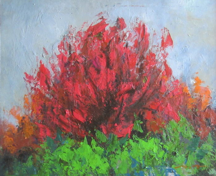 紅の風景。ナイフで大胆に描いてみた。名もない名もない紅葉の風景。