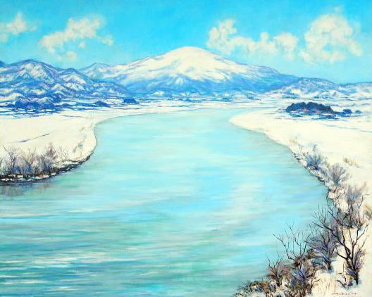 | 庄内側からも月山を眺めることが出来るが、起伏に富んだ荒々しい月山であり、一方内陸側からはお椀を伏せたように丸く美しい月山を望むことが出来る。 月山、最上川を描かれた先達の先生方の中でも菅野吉晴先生は自分の画業に厳しく徹底され、妥協のない方であった。先生の月山はまさしく「霊峰」であり荘厳である 「月山、最上川」は自分にとって勇気を必要とする壮大なテーマであったが、本年50歳の節目を持って思い切ってチャレンジしてみようと決心した。美しい自然への感動、春を待つ気持ちを少しでも表現できれば幸いである。 |